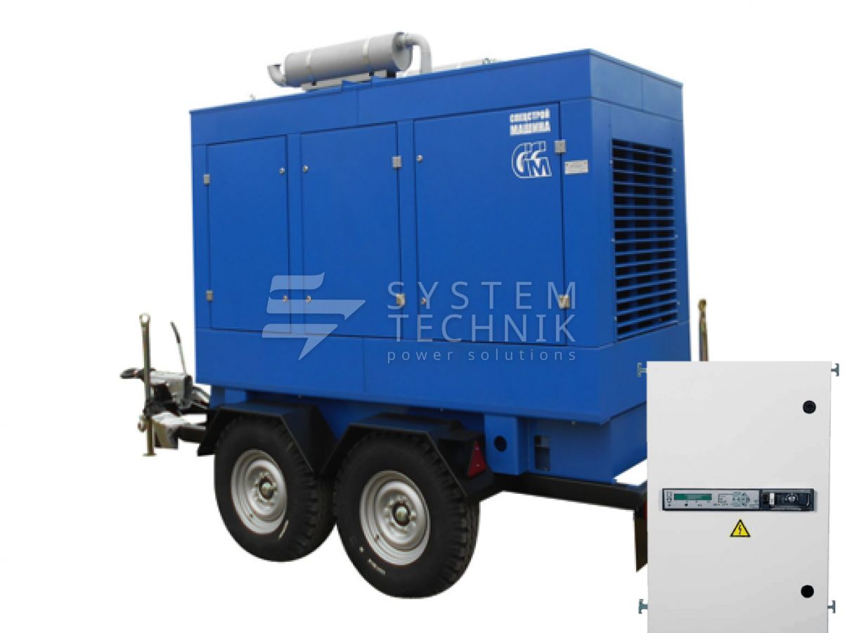 - ССМ ЭД-100-Т400-2РПМ2 (Marelli) в погодозащитном кожухе на шасси с АВР на прицепе