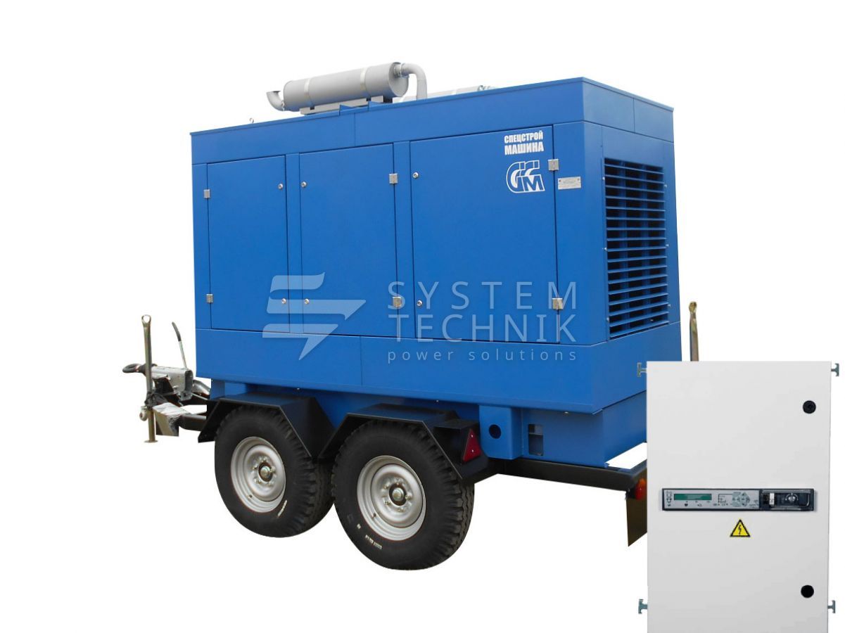 - ССМ ЭД-120-Т400-2РПМ2 в погодозащитном кожухе на шасси с АВР на прицепе